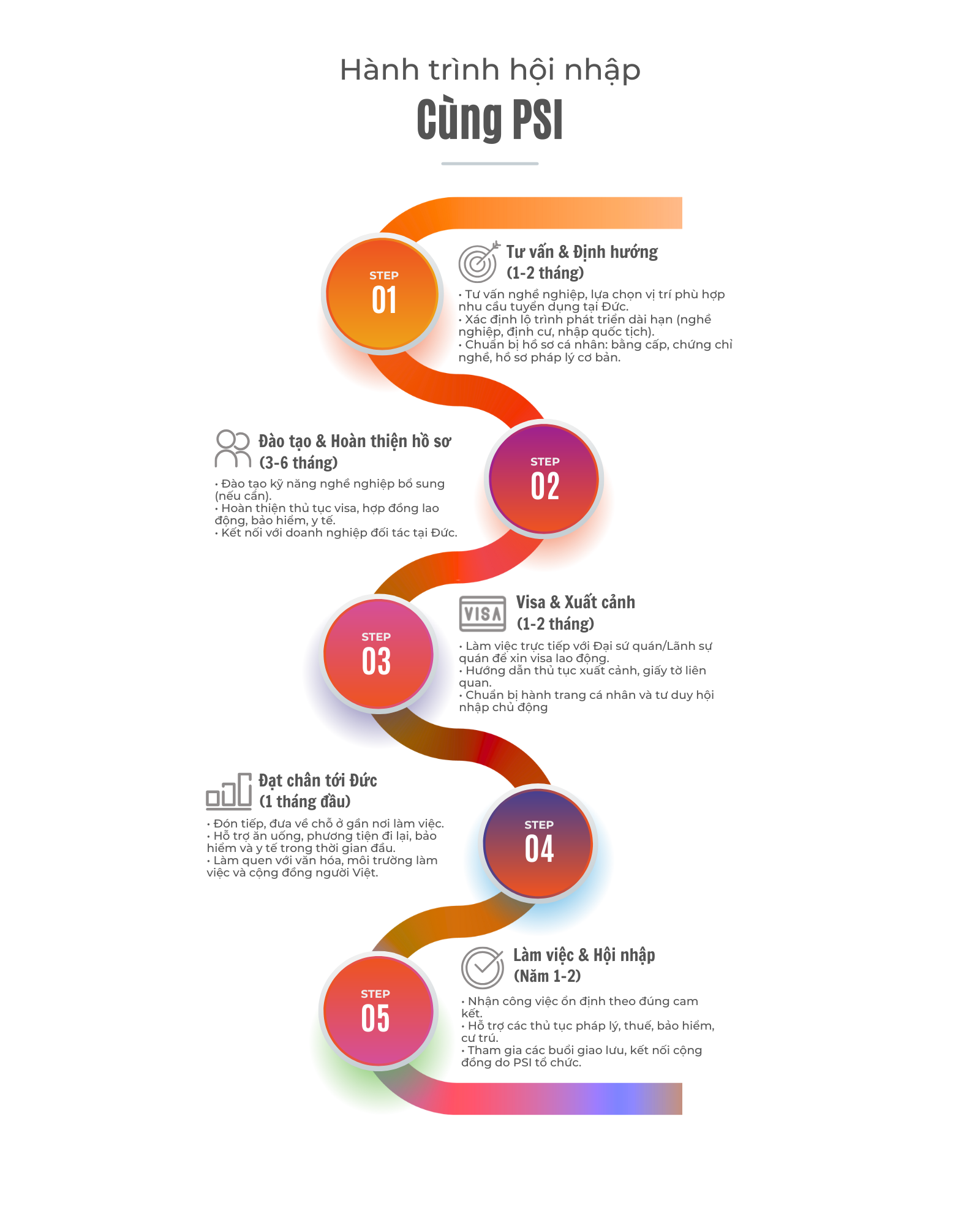 PSI chú trọng vào định hướng nghề nghiệp, đào tạo kỹ năng đạt chuẩn quốc tế và hỗ trợ pháp lý trọn gói, giúp người lao động tự tin sinh sống và làm việc tại Đức. Đồng thời, công ty xây dựng lộ trình phát triển dài hạn, mang đến cơ hội việc làm ổn định, định cư và nhập quốc tịch cho những ai mong muốn gắn bó lâu dài.
